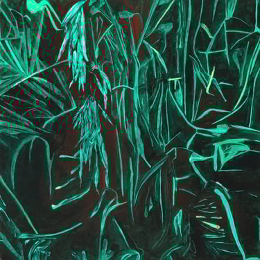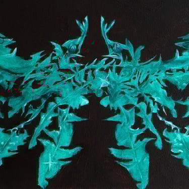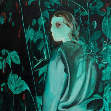 A projected world of nocturnal ephemeral spaces, Holbrough’s work delineates omitted realities using liminal forms to confront the unseen. The transcorporeal environment engulfes the canvas, while only specific elements are detailed and fleshy. The sea of phthalo green illuminates the dark night scene. You are brought into an untethered world, where you are forced to confront your ignorance.